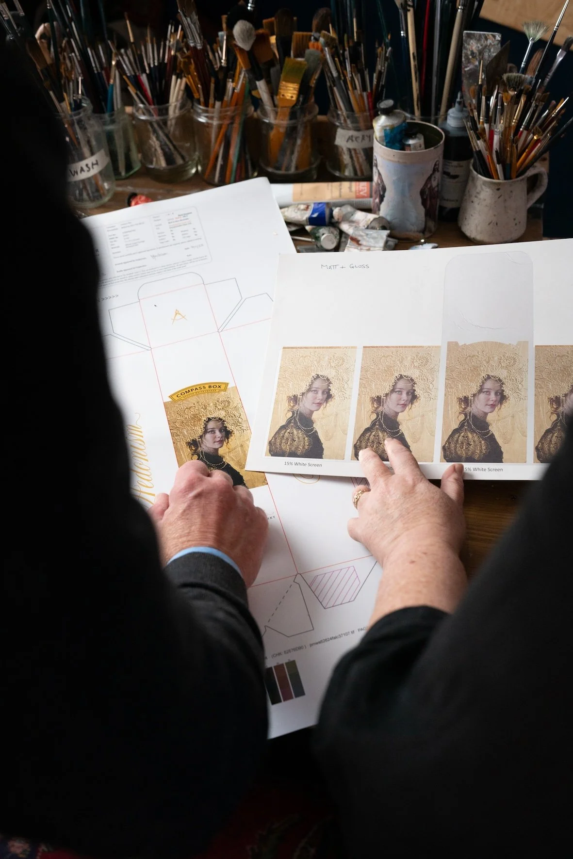 During those years Rew would spend hours every day studying, analysing and painting Alex’s face – a face she knew more intimately than her own. So, three years later, when whisky company Compass Box approached her to create the artwork for the latest release of their famous whisky Hedonism, it could only have been Alex.